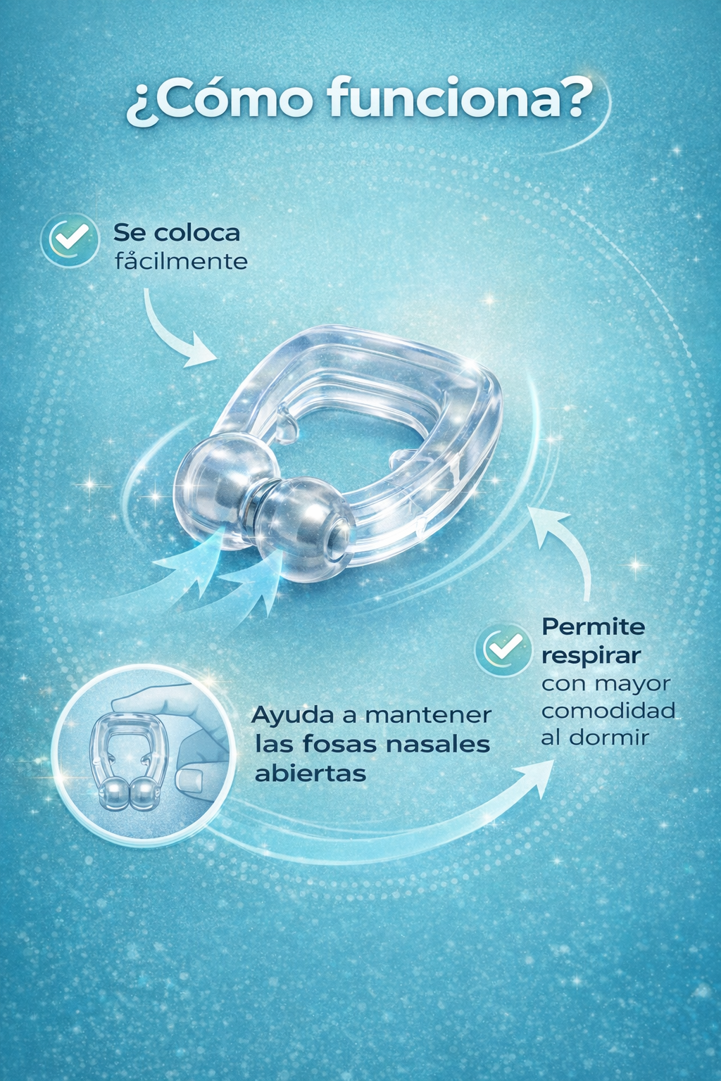SleepClip™ actúa abriendo suavemente las fosas nasales, permitiendo una mejor entrada de aire durante el sueño.